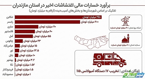 گفتنی است در اغتشاشات اخیر تنها،  ۲۵۰ میلیارد تومان به تنکابن، ۲۰۰ میلیارد تومان به رامسر، ۷۰ میلیارد تومان به ساری، ۶۰ میلیارد تومان به قائم‌شهر و ۵۵ میلیارد تومان به آمل خسارت وارد شده گه مجموع خسارت این ۵ شهرستان، باقی از ۱۷ شهرستان دیگر استان، افزون بر ۶۳۵ میلیارد تومان بوده است.