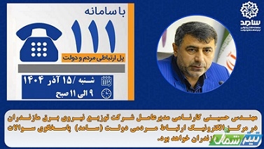 روابط عمومی شرکت توزیع نیروی برق مازندران در اطلاعیهی اعلام کرد: شهروندان شریف مازندرانی میتوانند در روز شنبه، ۱۵ آذر ۱۴۰۴، از ساعت ۹ صبح تا ۱۱ ظهر، از طریق تماس با سامانه تلفنی ۱۱۱، بدون واسطه با مهندس حسینی کارنامی، مدیرعامل توزیع برق استان، در خصوص مسائل مرتبط با خدماترسانی، شبکه برق، طرحهای توسعه و سایر موضوعات مربوطه به صورت مستقیم صحبت کنند.